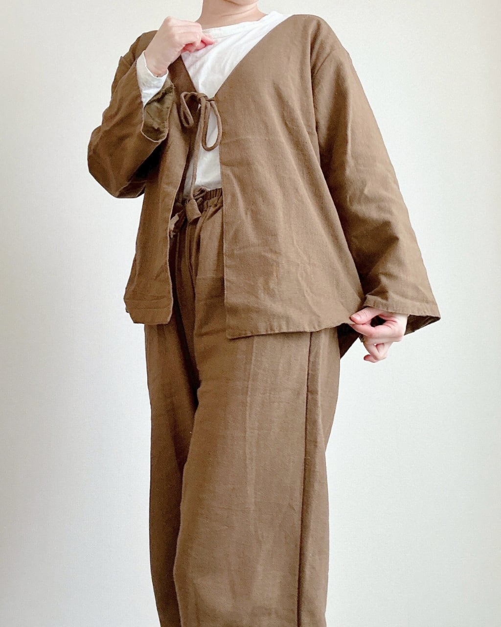 ヘンプ素材を贅沢に使用した、Vネックフレアーカーディガンとロングパンツのセットアップ。シンプルでありながら個性的なデザインが特徴で、さまざまなシーンにマッチします。軽やかで心地よい着心地は、一日中快適に過ごせること間違いなしです!