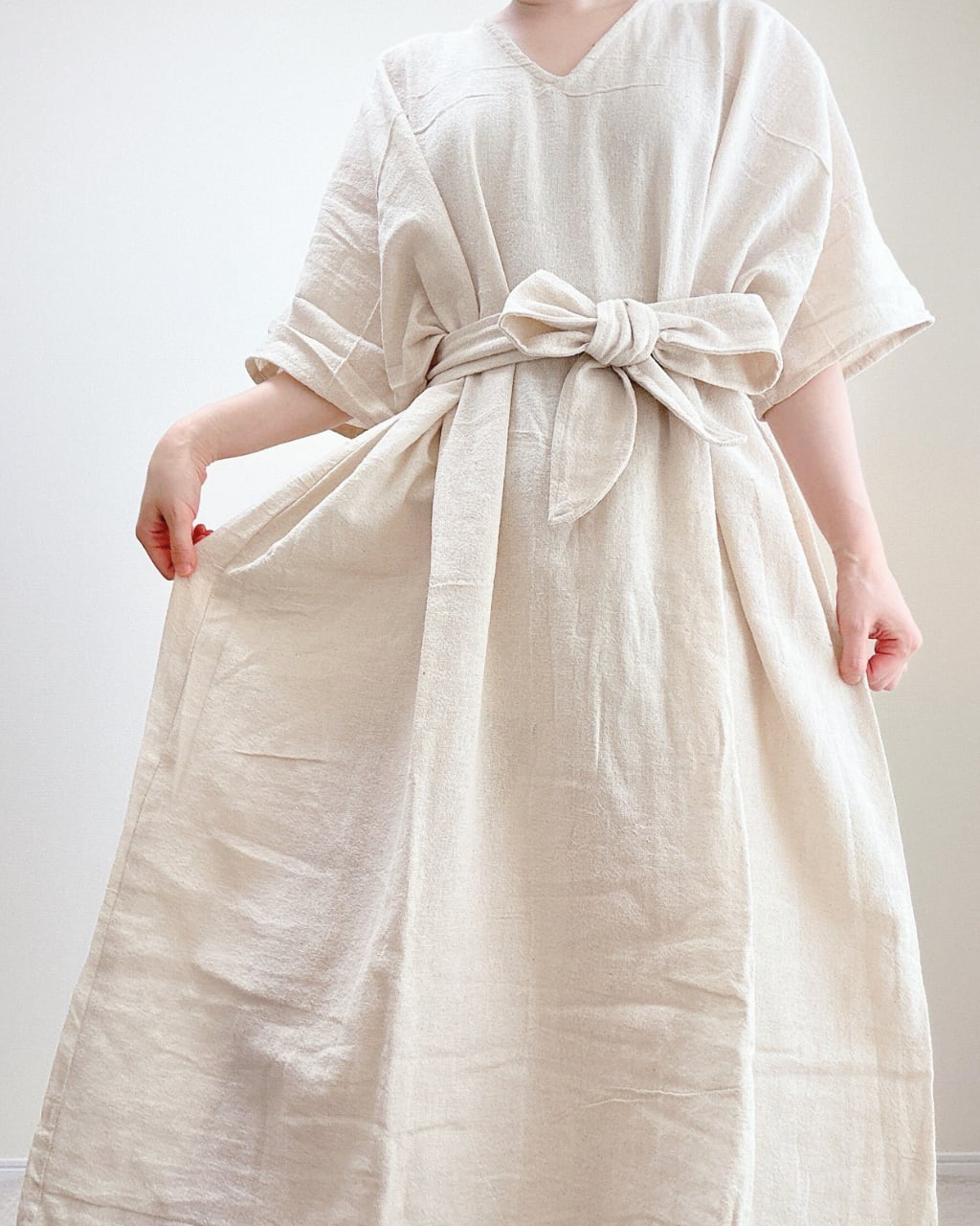 フワッと風を含むような、ゆったりシルエットが心地よいワンピース。リボンベルトを外してゆったりリラックス。リボンベルトをつけてウエストマークでおしゃれに細見えも実現。その日の気分に合わせてコーディネートを楽しめます。できれば二の腕は出したくない!そんな方にも嬉しい袖の長さ。肌は隠れるのに、ヘンプ生地だから通気性があり暑くないのも心地よさのポイントです。