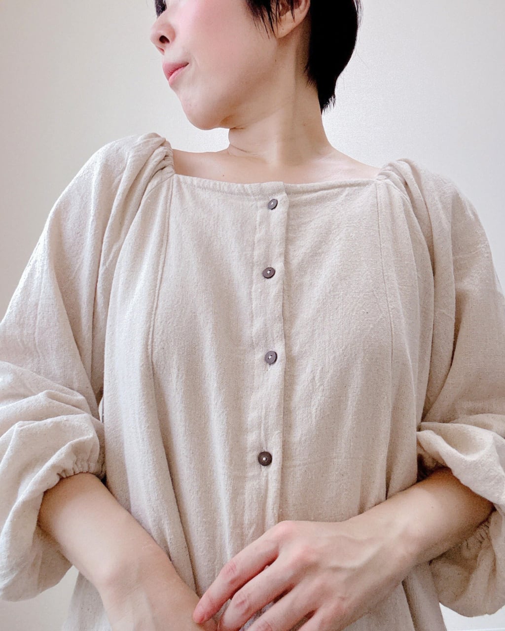 はじめは軽やかなシャリ感があり、着る回数が増えるたびに、洗い重ねるごとに柔らかさが増します。ヘンプ生地によっては生地が縮む場合があります。天然素材100%の素材の為、ネップと言われるプツッと繊維が出ている場合がありますが、そちらも可愛がってあげてくださいね。お洗濯は乾燥機は避けていただくことをおすすめします。