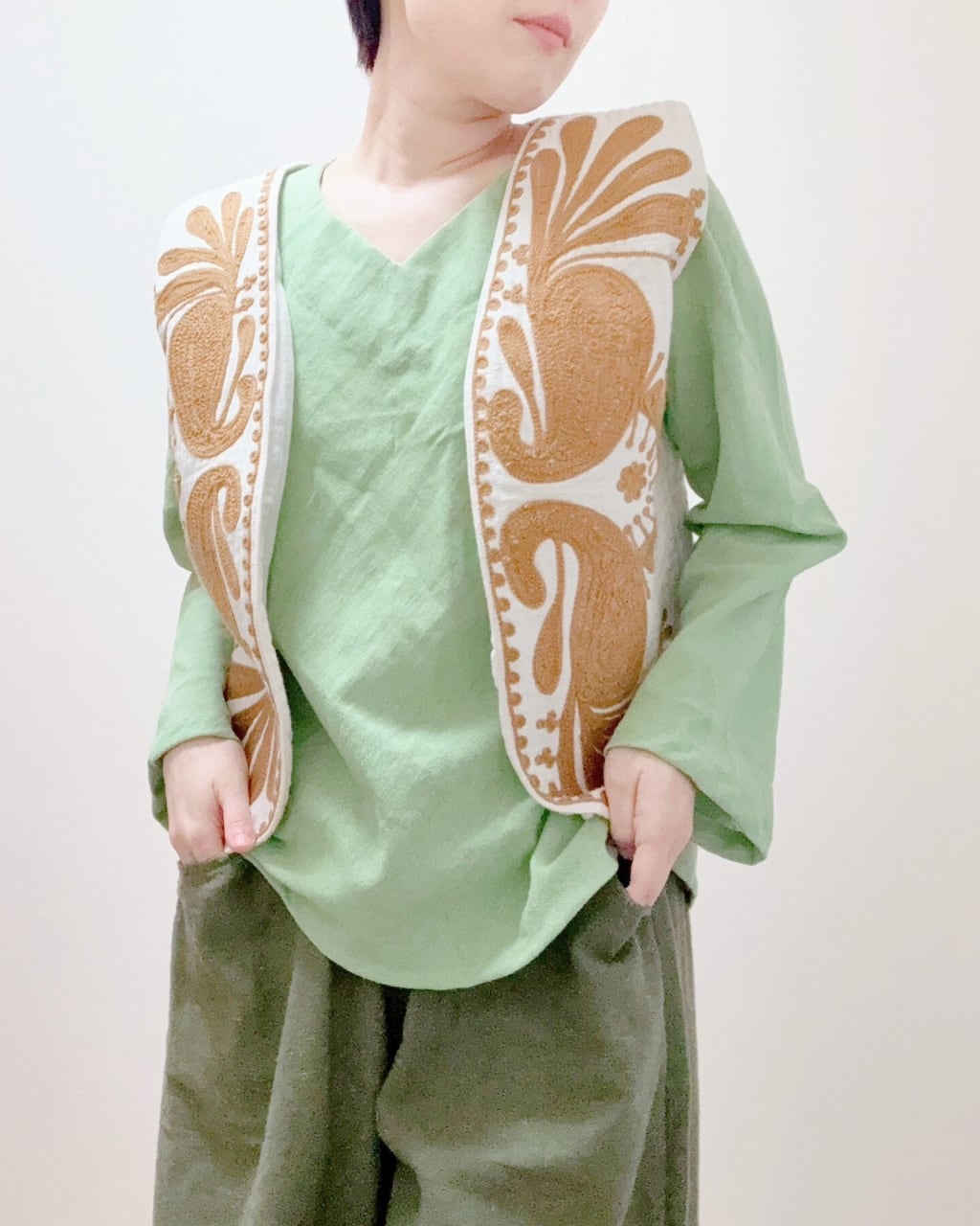ヘンプ素材は、はじめはしっかりとした触り心地ですが、着用することで徐々に柔らかくなり、心地よいフィット感が得られます。また、通気性や吸湿性に優れており、快適に過ごせます。洗濯を重ねるほどにその風合いが深まり、長くご愛用いただける一着となります。お手入れは洗濯ネットを使用して、形を整えて干すことをお勧めします。