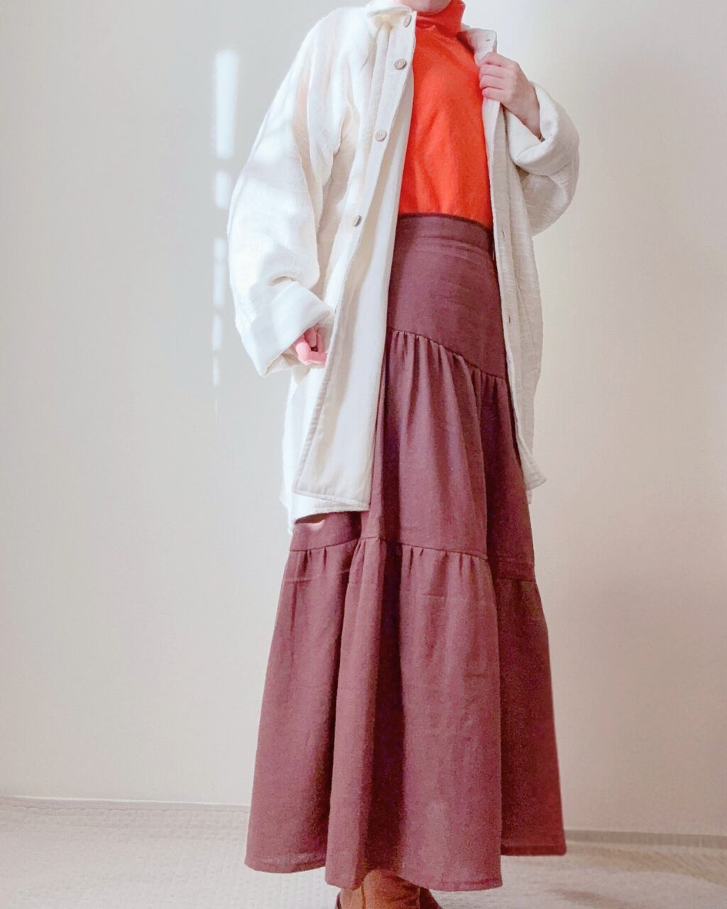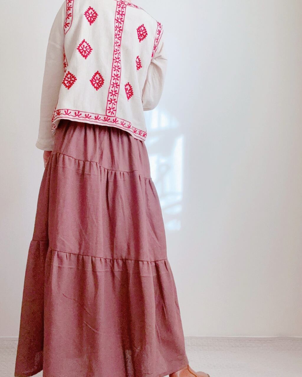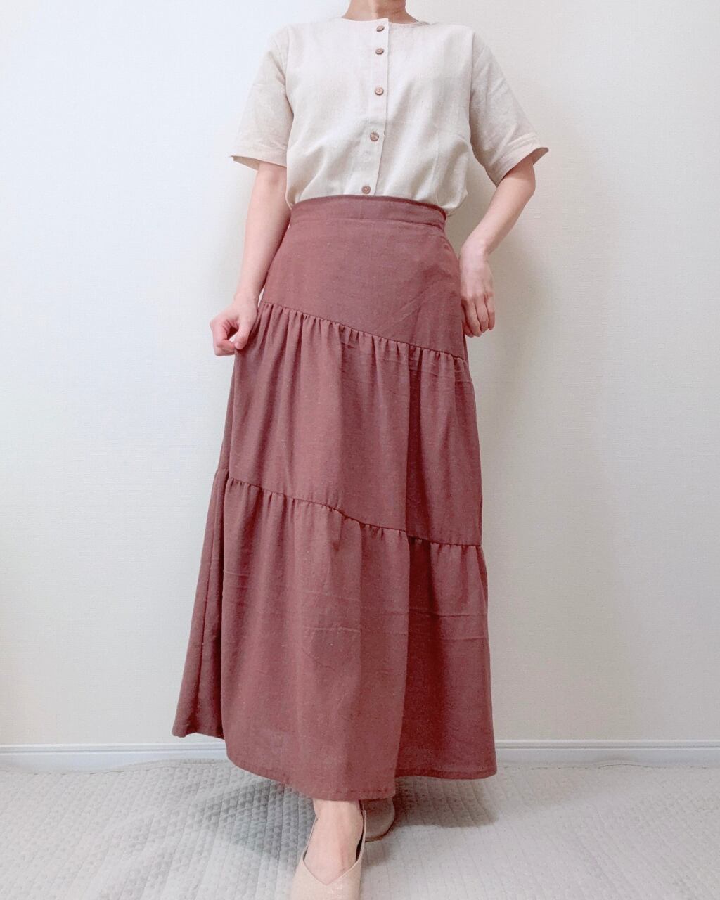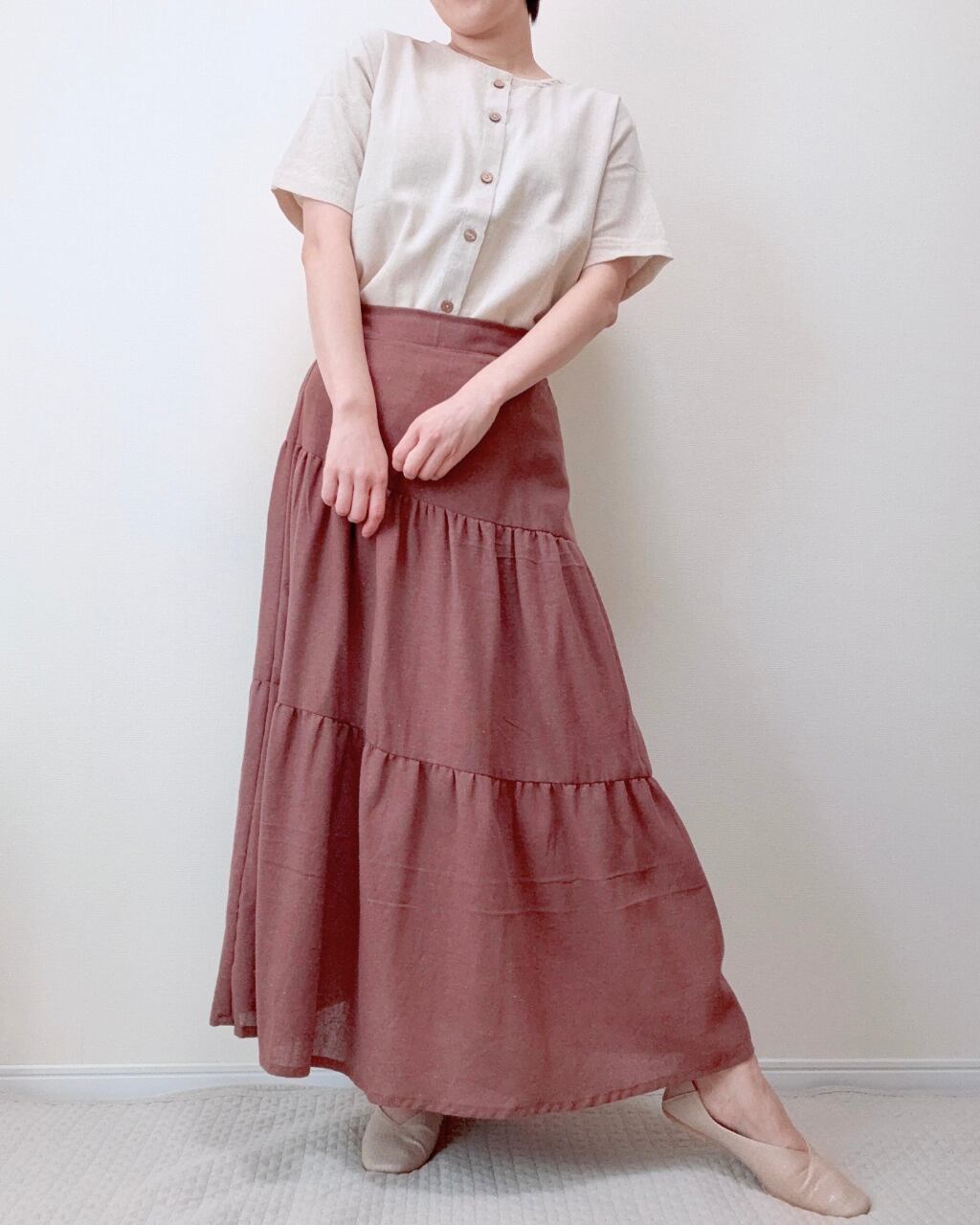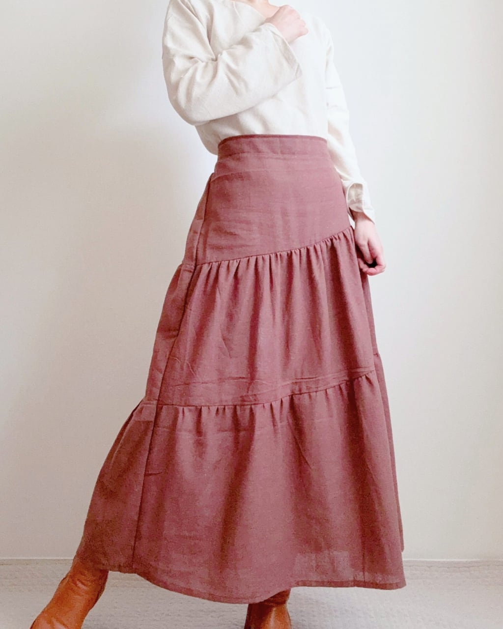 深みのあるマロンカラーと斜めの切り替えが特徴のティアードの優雅なシルエットが魅力なロングスカートです。