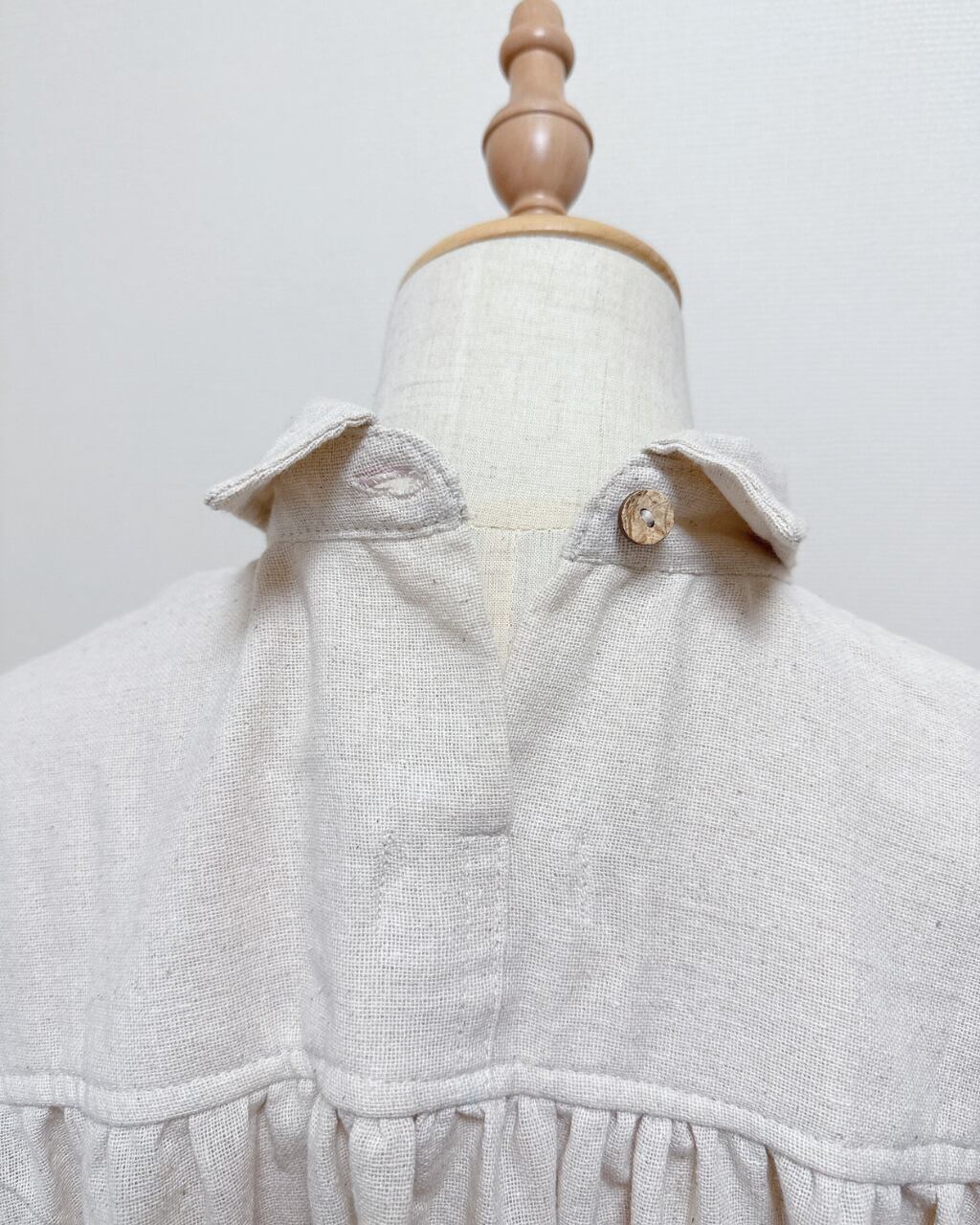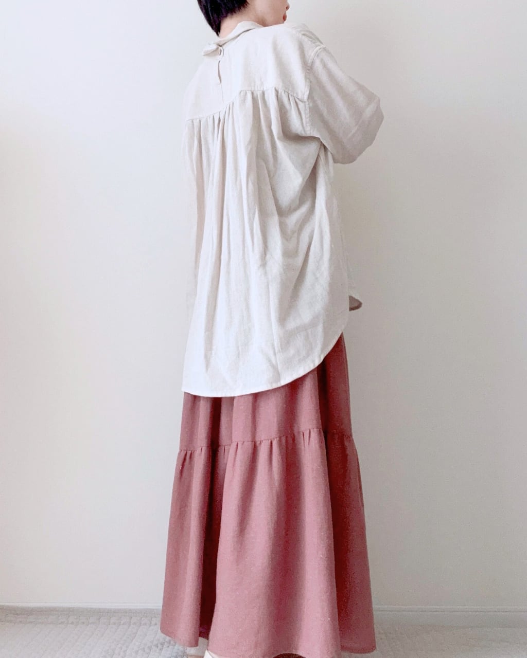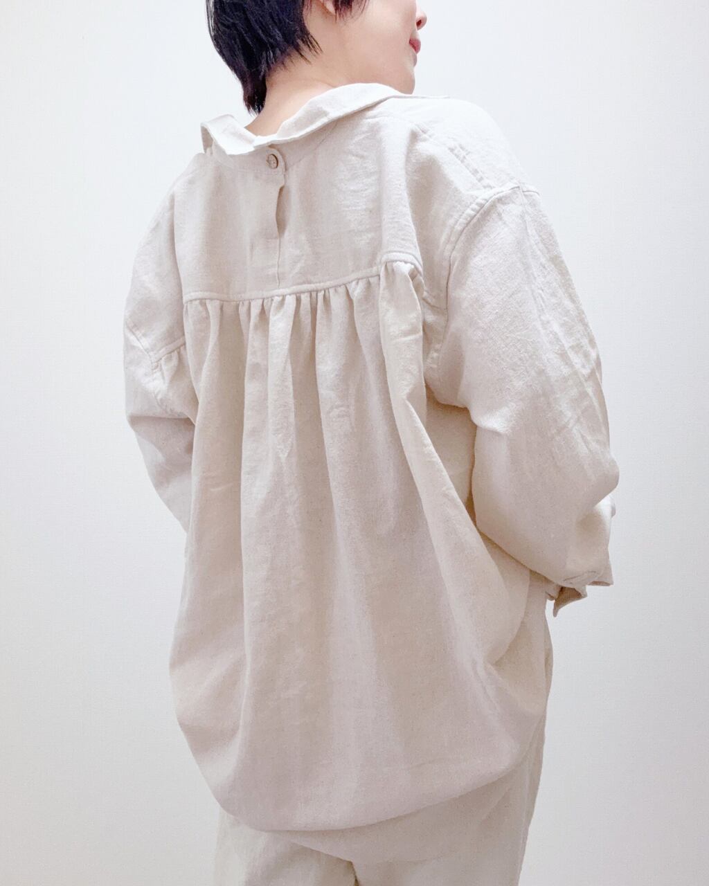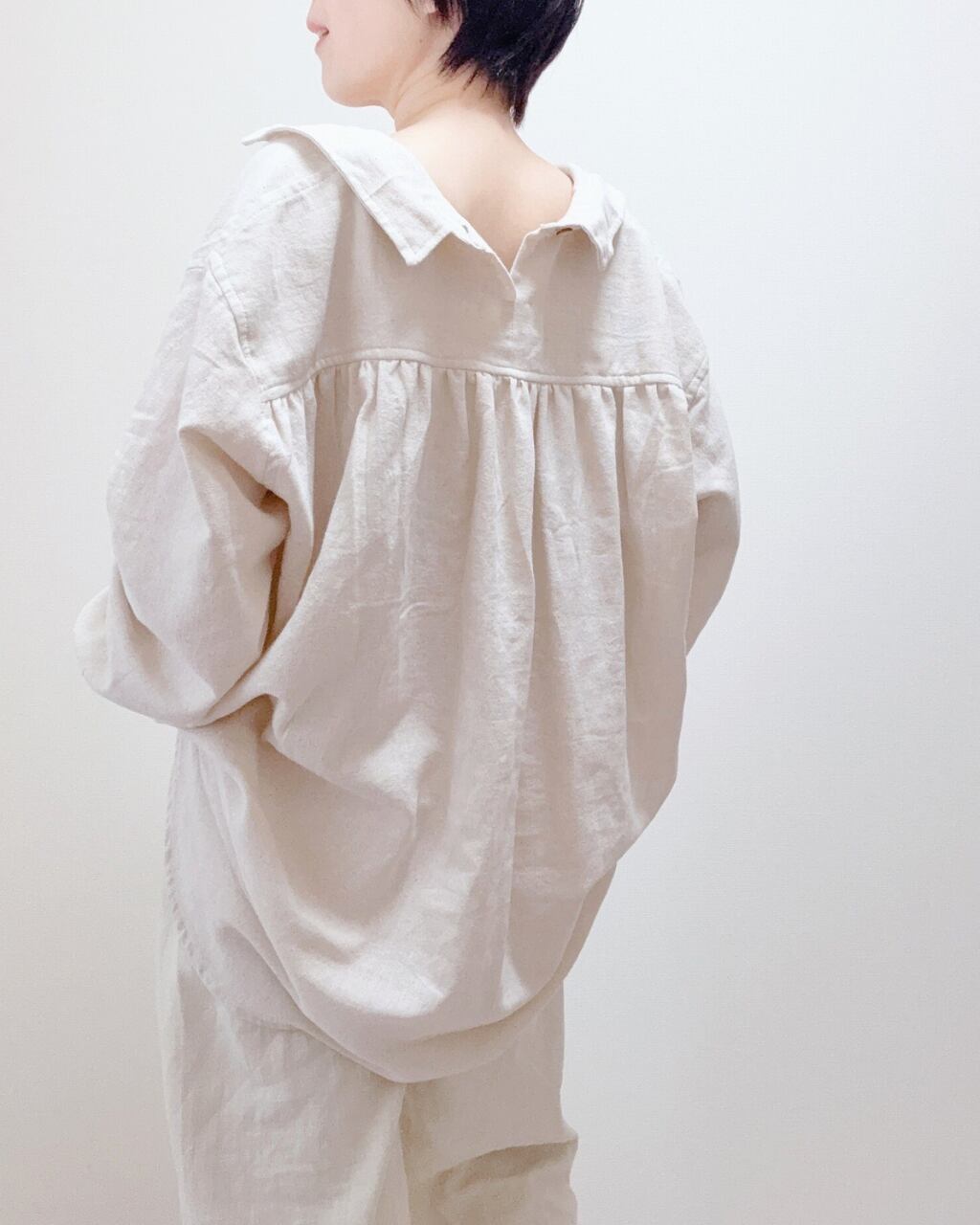フロントは、すっきりシンプル。えり後ろのスリットと、後身頃のやわらかなギャザーがさりげなく印象に残るバックスタイルに。動いたとき、後ろ姿にふわっと余白が生まれ、気負わず整って見える一枚です。