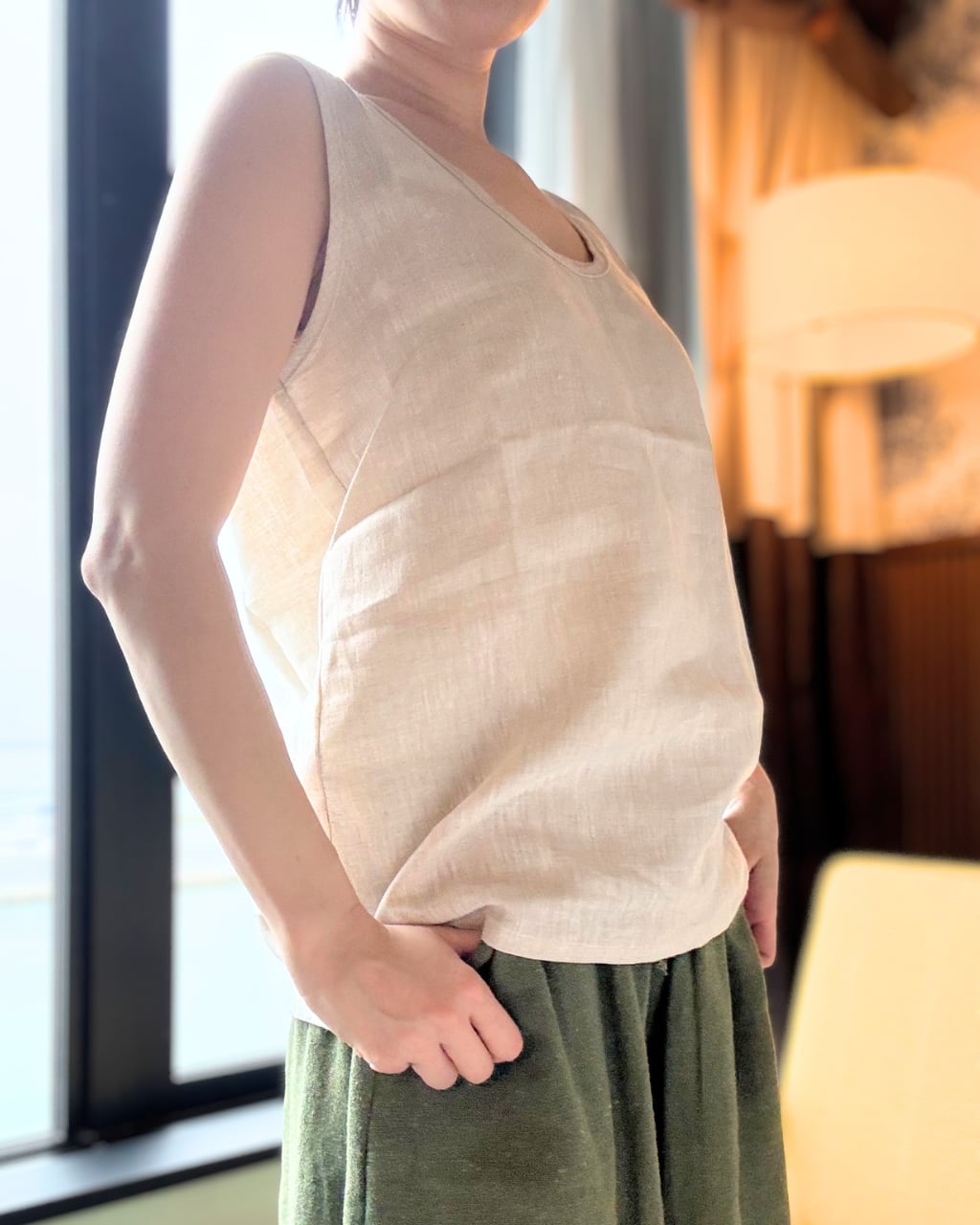 ヘンプ素材は、はじめはしっかりとした触り心地ですが、着用することで徐々に柔らかくなり、心地よいフィット感が得られます。また、通気性や吸湿性に優れており、夏の暑さでも快適に過ごせます。洗濯を重ねるほどにその風合いが深まり、長くご愛用いただけるタンクトップとなります。お手入れは洗濯ネットを使用して、形を整えて干すことをおすすめします。